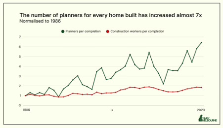 It is universally recognised that the time and cost of development approvals is a problem, but that is an issue of planner productivity not construction productivity. Research from YIMBY Melbourne found ‘In 1986, for every practicing planner, Australia built around 54 homes. Now, we build fewer than nine homes per planner. A planner 40 years ago was on average responsible for the development of six times the number of homes per year than a planner working today.’