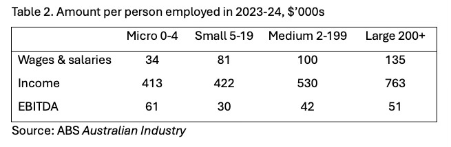 Comparing the amount per person employed highlights the differences between the firms. Table 2 has wages and salaries, income and EBITDA, and shows wages and salaries and income per employee increases with firm size, as would be expected, with a significant difference between Medium and Large firms. However, Micro firms have the highest EBITDA, at $61,000 per person, and this suggests Micro firms substitute company earnings for wages and salaries.