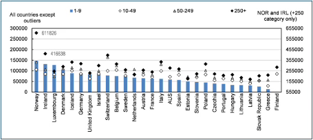 The 2025 OECD Compendium of Productivity Indicators said: ‘On average across countries, firms with more than 250 employees produce about twice as much output per hour as firms with 10-19 employees. Within each country, large firms also tend to be about 75% more productive than mid-sized firms (50-249 employees), and around one-third more productive than firms with 100-249 employees. These patterns point to substantial productivity differences by firm size, even within national economies.’ Figure 1 below is from the report, with the blue bars showing small firms and the black diamonds large firms in the business economy: ‘Labour productivity by enterprise size-class is measured as gross value added at current prices per person employed. Labour input is measured as total employment.’