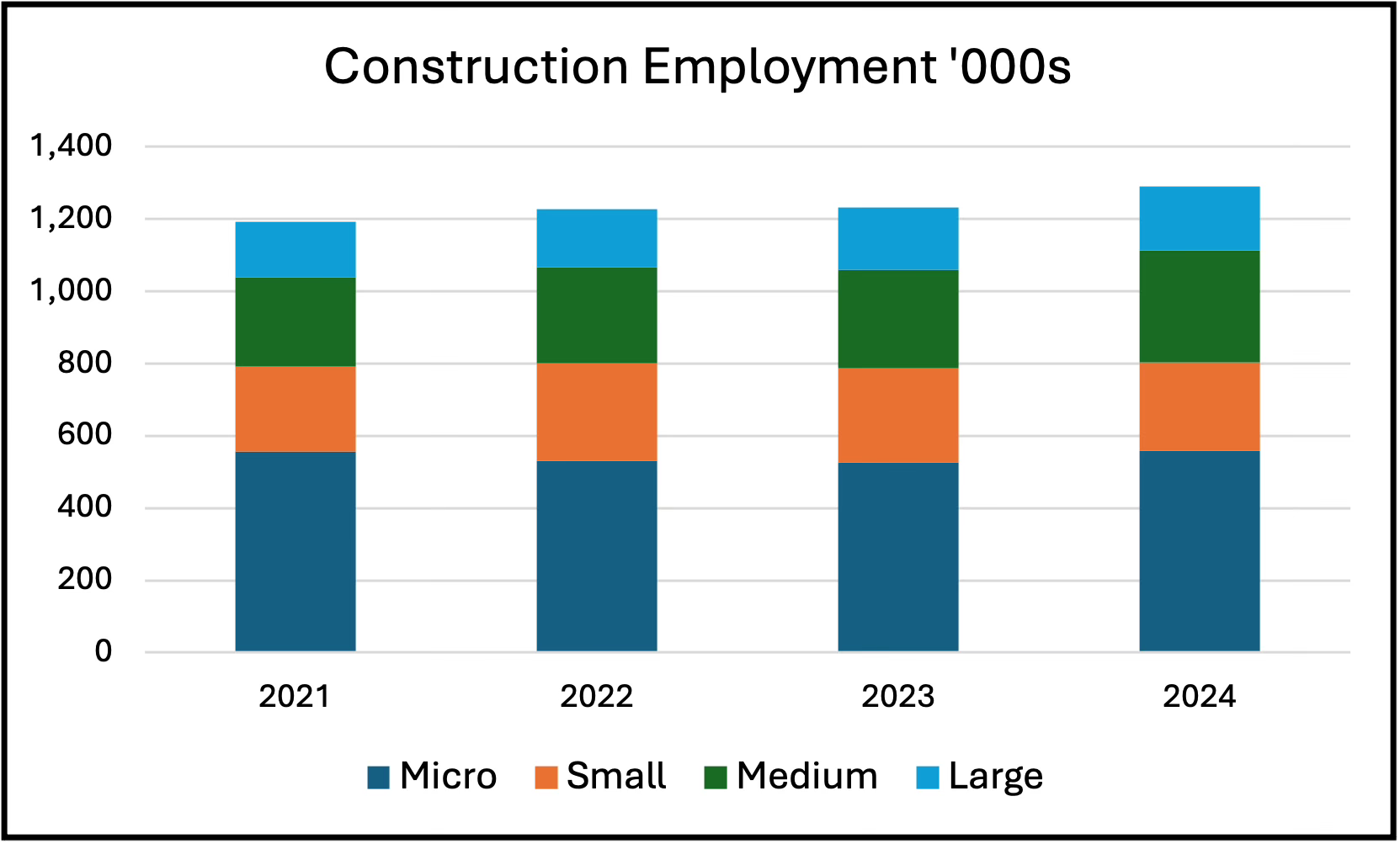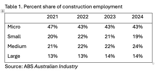 Micro firms had 43 percent of construction employees in 2023-24. However, that share has fallen since 2020-21, when Micro firms were 47 percent of total employment. In 2024 the employment share of Small firms was 19 percent, of Medium firms 24 percent, and Large firms 14 percent. The trend in employment shares has varied. Small firms increased their employment share in 2021-22, but that has since fallen as the shares of Medium and Large firms increased .