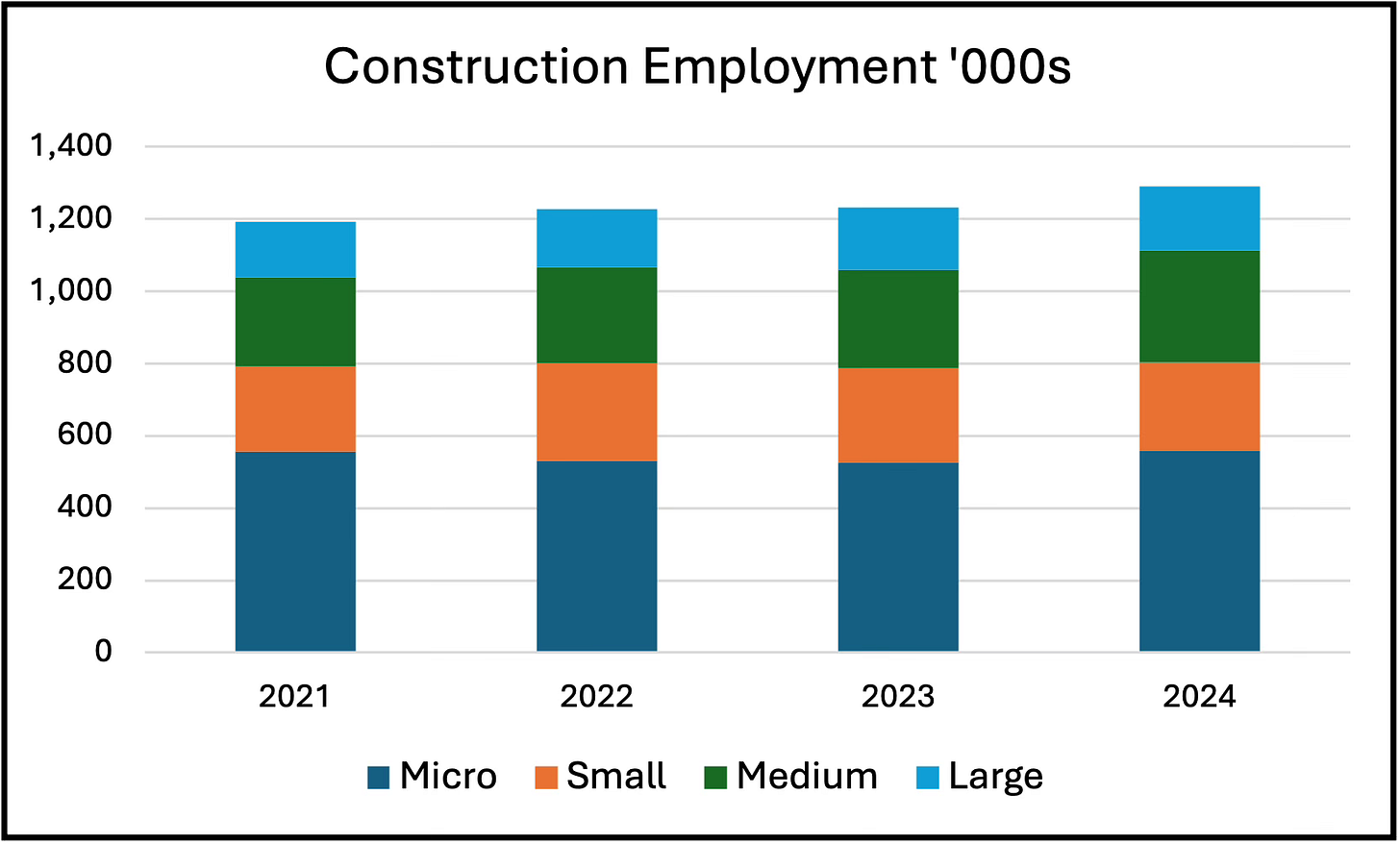 Between June 2021 and 2024 total construction employment increased by 100,000 people, and in June 2024 there were 1,291,000 employed. However, as Figure 3 shows there has been no change in the number employed by Micro firms, which was 560,000 in 2025, and only 10,00 more employed by Small firms with 244,000 in 2023-24. Employment growth has been greatest in Medium firms, increasing from 247,000 in 2021 to 309,000 in 2025, while Large firms went from 155,000 to 178,000 employees.