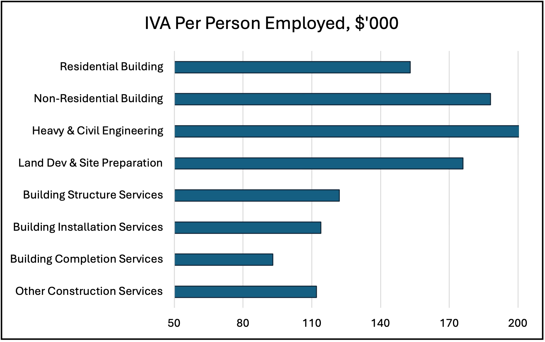 As Figure 9 shows, Engineering and Non-residential building had the highest IVA per employee. Land development and site preparation had the third highest IVA per employee, followed by Residential building. The four Construction services groups of Building structure services, Building installation services, Building completion services and Other construction services had IVA per employee values ranging from $93,000 to $122,000, or around half the level of Engineering.