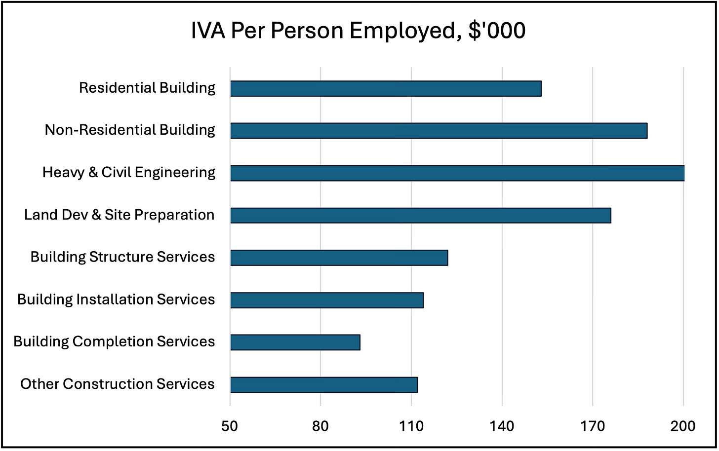 Australian Industry also provides data for the three industry subdivisions of Building, Engineering and Construction services, and the industry groups within them. Unsurprisingly, IVA per employee was highest in the capital intensive Engineering subdivision at $214,000. It was $164,000 for Building, and $116,000 in Construction services.
