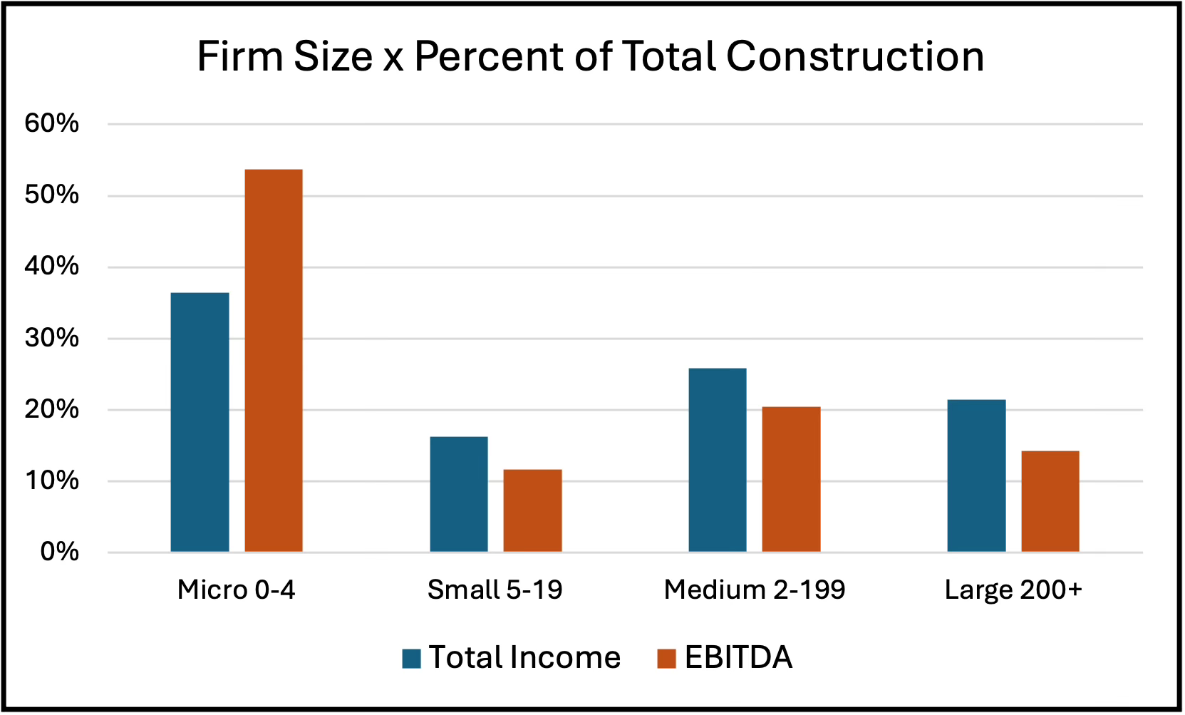 In 2023-24, Micro firms had 43 percent of total construction employment but pay only 20 percent in wages and salaries, Small firms had 19 percent of employment and 21 percent of wages and salaries, Medium firms 24 percent and 33 percent, and Large firms 14 percent of employment and 26 percent of wages and salaries. The shares of the firm size categories are reversed for income and EBITDA.
