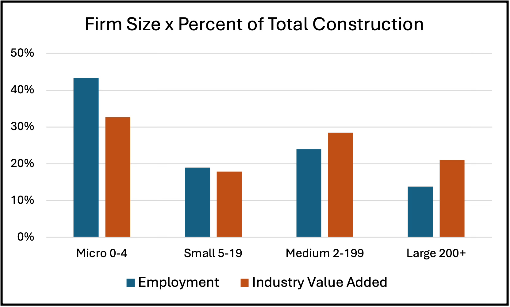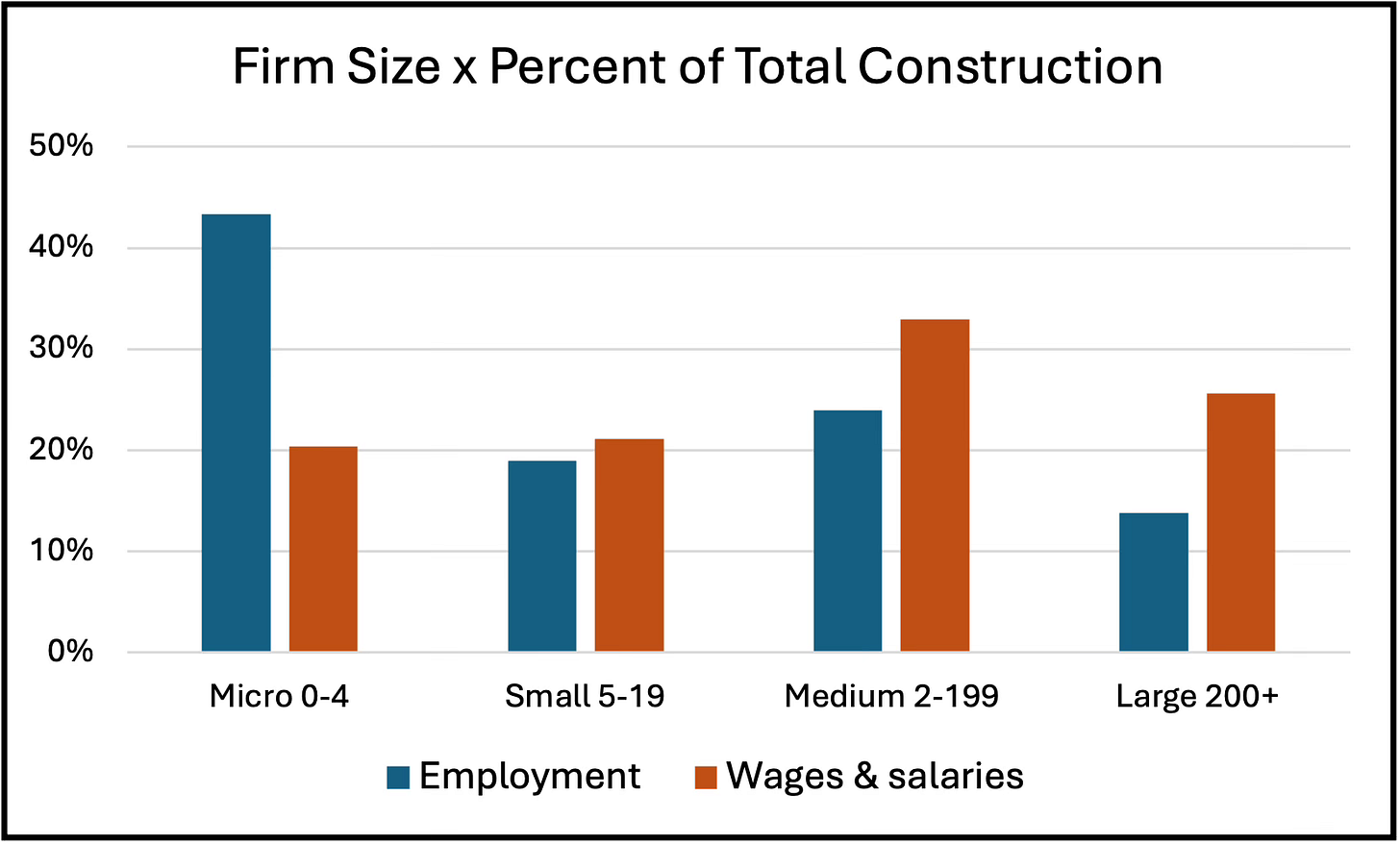 As a share of total construction, despite having 43 percent of employment, Micro firms pay only 20 percent in wages and salaries. For small firms the shares are almost the same at 19 and 21 percent, but for Medium firms they are 24 and 33 percent, and for Large firms they are 14 and 26 percent.