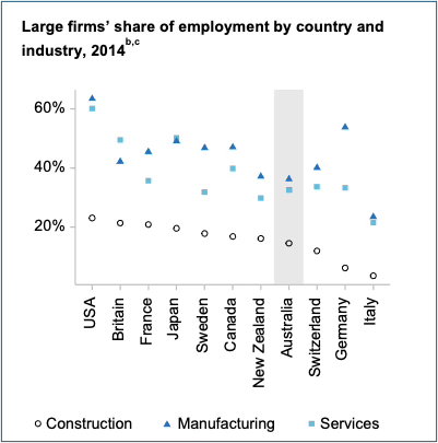 The report found in 2024 the average construction firm had 2.7 employees (not including sole traders or owner-managers), and residential construction averaged 1.5 employees in house construction and 1.9 in multi‑unit apartment and townhouse construction. It had Figure 2, showing Australia is not unique, in other countries the employment share of large firms is lower in construction than in manufacturing or services.