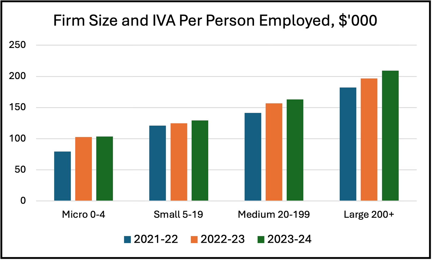 Industry value added (IVA) per person employed can be used as a proxy for labour productivity. When IVA per employee for the firm size categories is compared the differences are stark. In 2023-24 Micro firms had $104,000 IVA per person employed, Small firms $129,000, Medium firms $163,000, and Large firms $209,000. As percentages of large firm IVA per person, Micro firms have 50 percent, Small firms 60 percent, and Medium firms 75 percent.