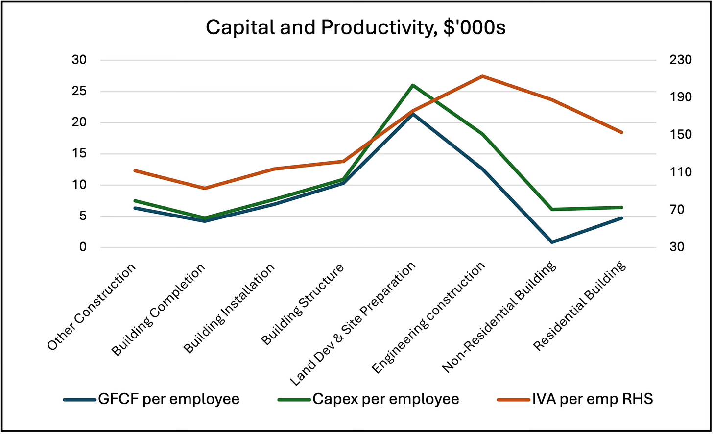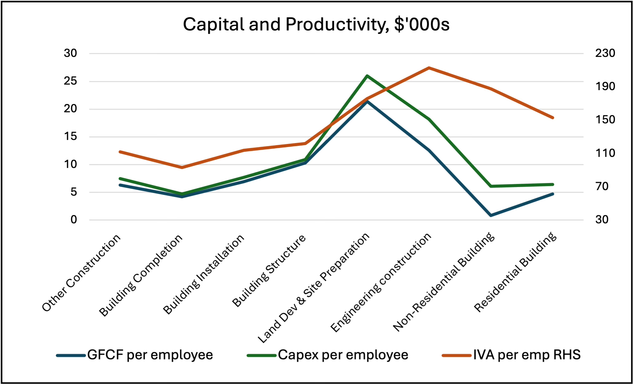 Land development and site preparation had the highest level for both capex and GFCF per employee indicators, due to including purchases of land and equipment. Similarly, Engineering has a high capex that includes purchases of machinery and equipment, and also the highest IVA per employee. Capex is low for Residential and Non-residential building because of the low level of ownership of heavy equipment and machinery due to extensive use of hiring and leasing, however that equipment and machinery lifts the level of IVA per employee. The other four trades in Construction services have capex and GFCF tracking IVA per employee, and are the best example of the relationship between capital and productivity.