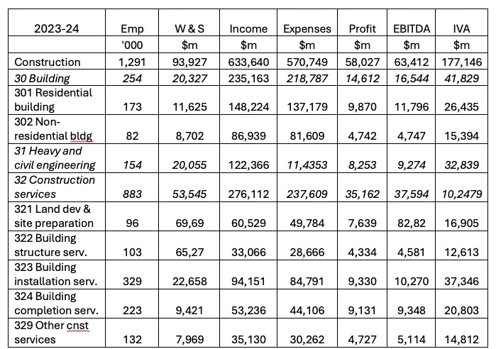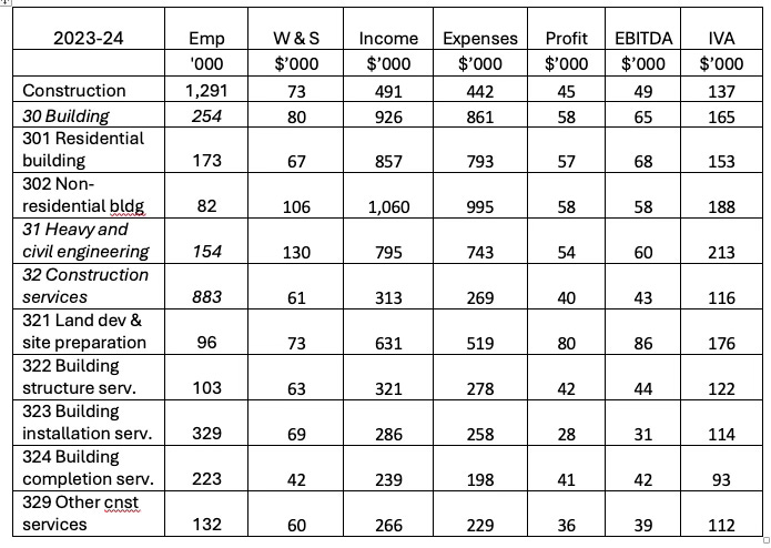 The Australian Bureau of Statistics has published detailed data on the Construction industry for 2023-24. Although released as part of the Australian Industry data, this is the seventh of a series of irregular and infrequent Construction Industry Surveys done by the ABS [1]. The ABS collected employment, wages and salaries, income, expenses, operating profit, earnings before interest tax depreciation and amortisation (EBITDA), and industry value added (IVA) for private sector construction businesses.