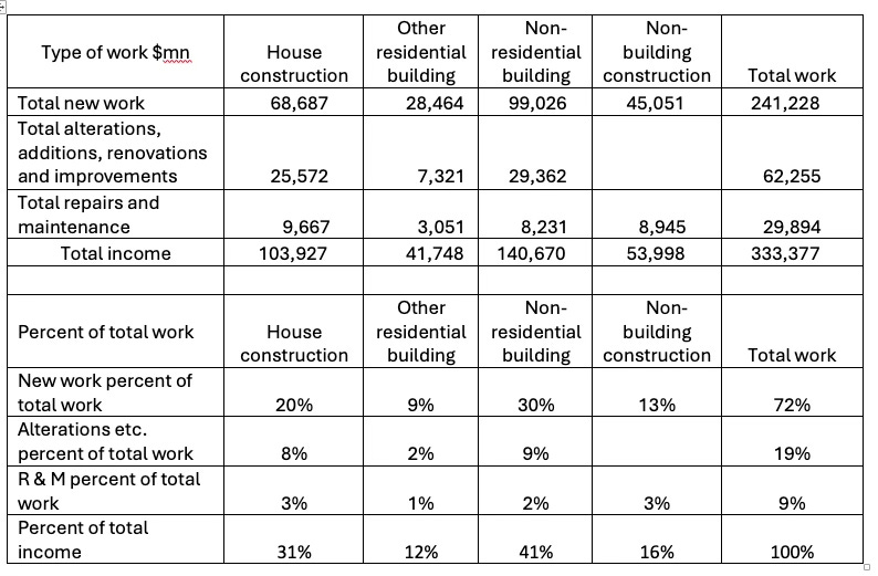 The 2023-24 Construction Industry Survey has provided a level of detail previously unavailable. Key insights are that 69% of total income is from contracting and subcontracting, with the rest from provision of services and sale of land and goods, and 9% of income is from repair and maintenance. Although only 18% of total contracting income is from the public sector, for Engineering it is 56%. Purchases of land by Residential building was $7bn and by Land development and site preparation $3bn, with $2.1bn and $1.3bn in interest costs respectively. In Non-residential building work, Alterations, additions, renovations and improvements income of $21.2bn was 41.2% of the income from New work of $51.3bn. For House construction by Construction services, income from New work was $30.6bn, and for Alterations etc. was $17.6bn, 57% of New work income.
