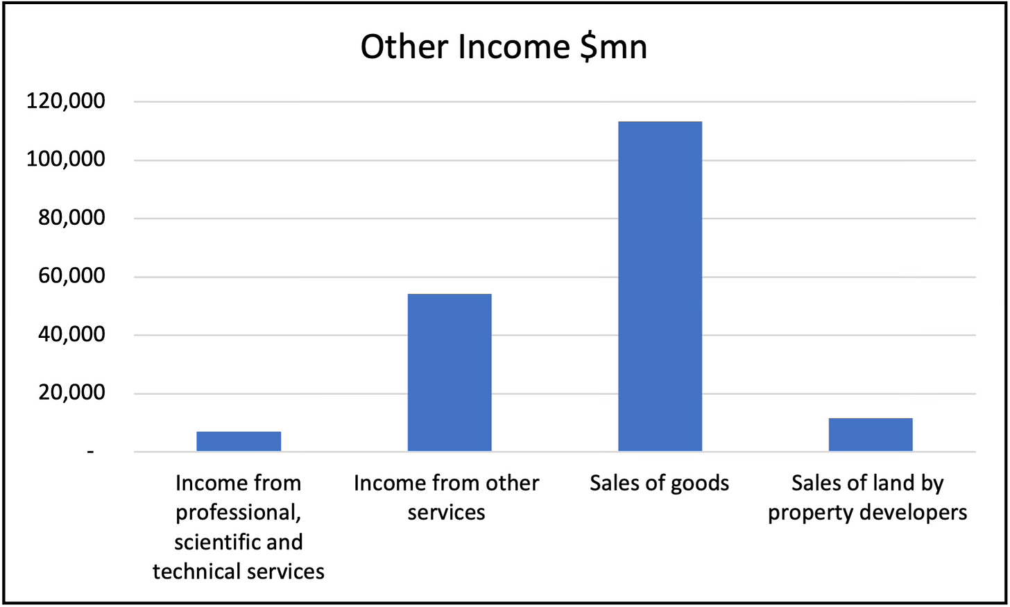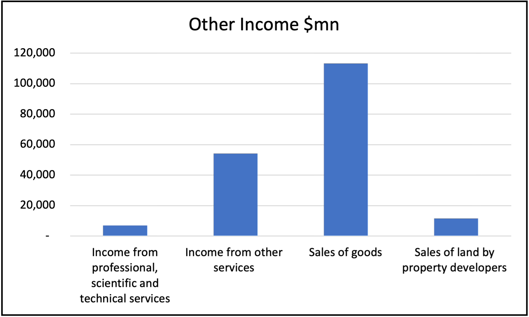 Purchases of land for property development was $12.2 bn, with Residential building accounting for $7bn and Land development and site preparation $3bn of the total. Those purchases incurred $2.1bn and $1.3bn in interest costs for the groups, which also had $762mn and $1.4bn in depreciation and amortisation expenses.