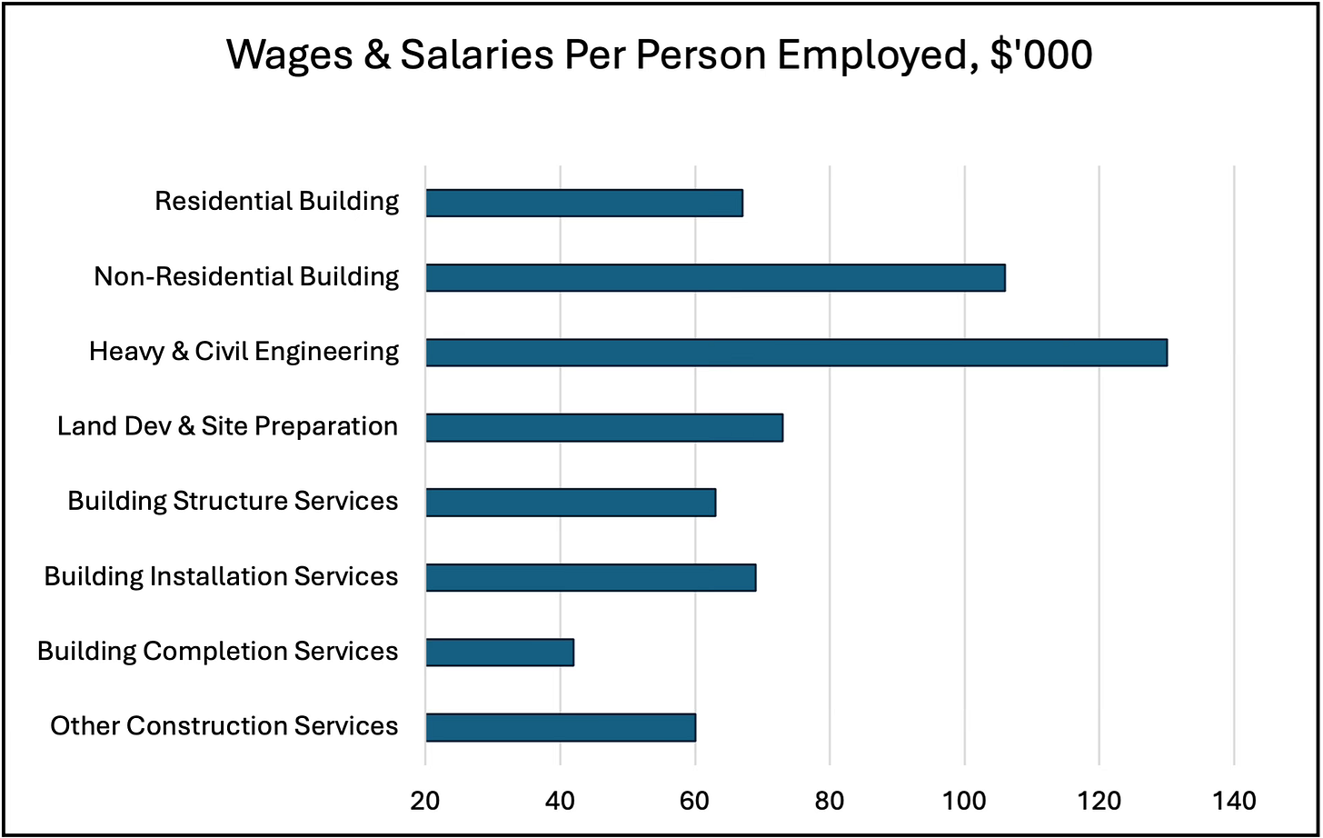 The ABS 2023-24 Australian Industry data included a survey of the Construction industry, with previously unavailable data on income from work done and type of work, clients and other variables at the level of eight industry groups. Therefore, this data has much more detail compared to the three industry subdivisions of Building, Engineering and Construction services used in regular ABS publications, because subdivisions are made up of industry groups.