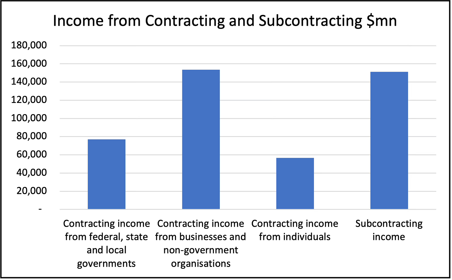 Building construction’s total income was $235.2bn, with $130.8bn from contracting and $21.5bn from subcontracting, contributing $152.3bn.
