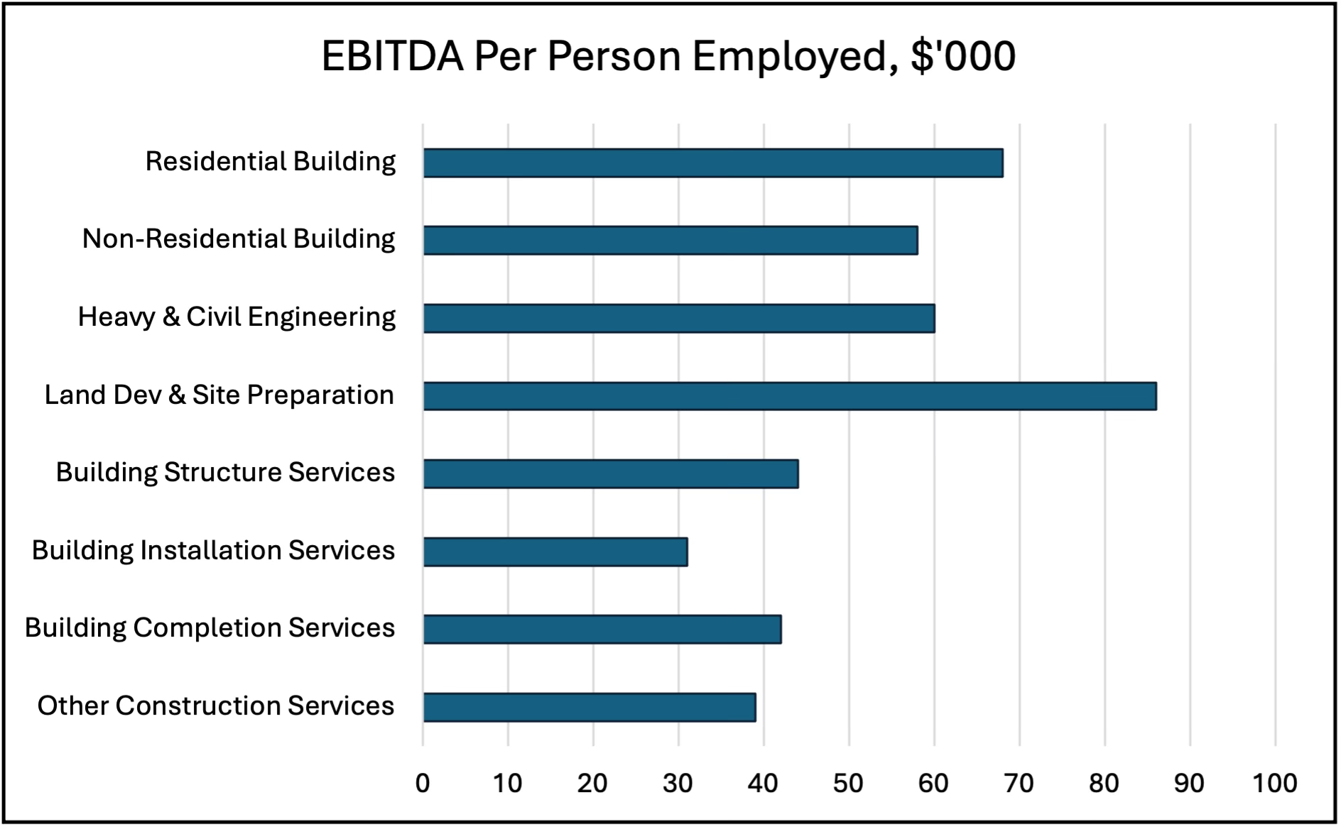 Construction services have lower wages, profits, earnings before interest, tax, depreciation and amortisation (EBITDA) and industry value added (IVA) per employee values than the Building and Engineering groups, particularly for wages and contracting income. Contracting income per employee is highest in Non-residential building, much more than Residential building and Engineering, and the three groups of Building installation, Building completion and Other construction services have almost the same contracting income per employee.