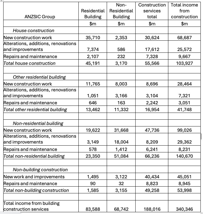 There is a new set of data in this year’s survey that has the income from different types of asset built, divided into houses, other residential building and non-residential building, and the type of work done, divided into new construction work, alterations, additions, renovations and improvements, and repairs and maintenance. This is given for the three Building groups of Residential and Non-residential building and Construction services.