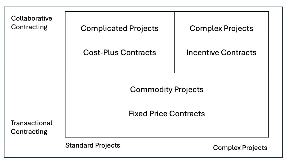 Traditional forms of project organisation and procurement are designed for delivering well documented commodity projects and making repetitive decisions in a stable, predictable environment. By contrast, complicated and complex projects are not fully documented and have significant uncertainty about their final form, and should be awarded through negotiation with a qualified supplier on some form of cost-plus or incentive contract. What will be an appropriate procurement strategy for a simple project will be inappropriate for more complicated or complex projects.