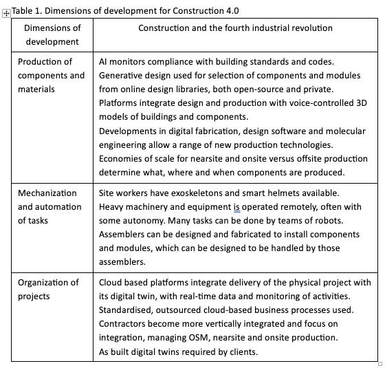 The current mix of onsite construction and offsite manufacturing has become a well-developed and efficient system, but the level of efficiency and productivity achievable is limited by the lack of significant economies of scale in a project-based industry. With 3D printing and digital fabrication this is no longer the case, and a new off/on/nearsite production mix that combines offsite mass production with onsite and nearsite manufacturing is possible. This introduces a new option in the organization of construction.