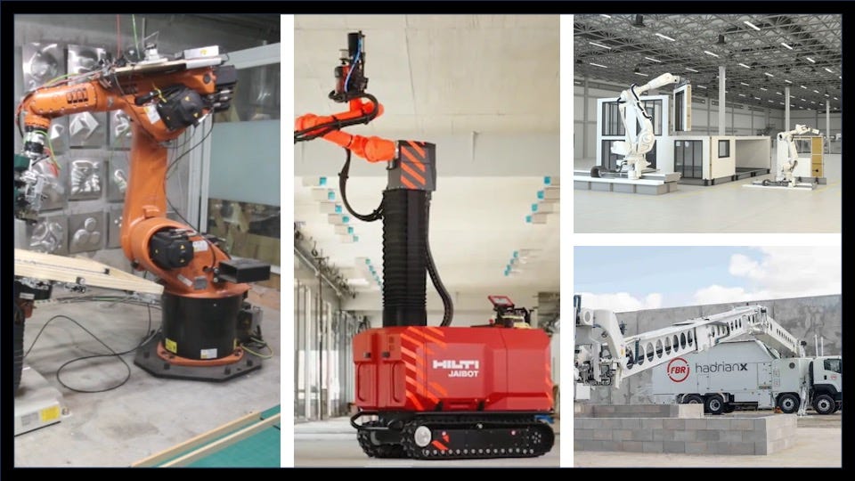 From left: RoBIM wall panel robot, Hilti Jaibot for M&E fixing, ABB robot team, FBR bricklayer