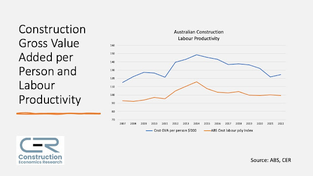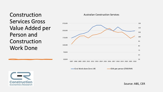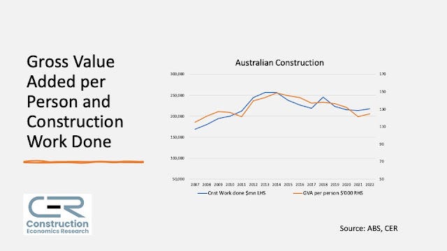 Over the last 15 years, Construction productivity in Australia has gone through a long cycle and ended up more or less where it began. The Australian Bureau of Statistics Construction labour productivity index rose from 92.88 in 2006-07 to 95.36 in 2010-11, before rapidly increasing to 115.94 in 2013-14, then falling to 99.1 in 2021-22. What explains the 10 year cycle between 2011 and 2021?