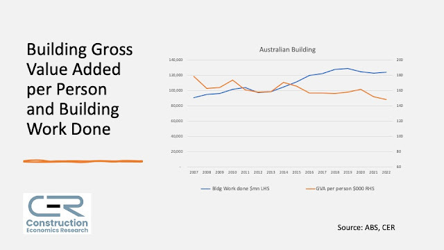 Productivity estimates require both a measure of labour inputs, such as hours worked or people employed, and a measure of output, called Industry value added (IVA, the difference between total revenue and total costs). IVA is then adjusted for changes in prices of materials and labour to estimate Gross value added (GVA) using price indexes. The ABS has a Construction industry labour productivity index, but does not have separate indexes for the different construction industry sectors.