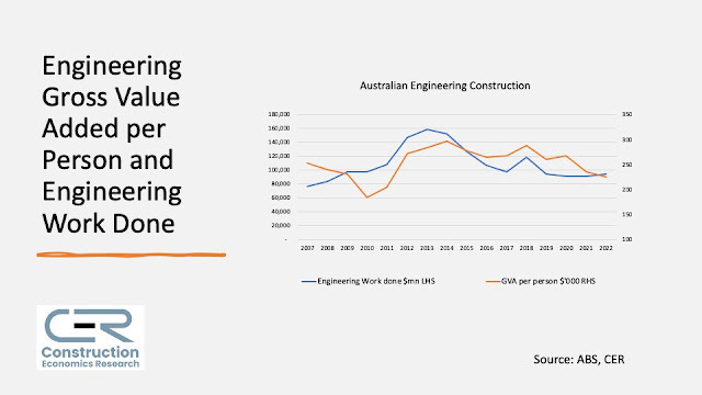 However, using GVA data, estimates of productivity for the industry sectors of Engineering construction, Building construction and Construction services can be found. The GVA data comes from the ABS National Accounts (chain volume measures of economic activity). The number of people employed includes all workers in June each year, and comes from ABS Australian Industry. The construction work done data is from the ABS chain volume Value of Construction Work Done, which is expenditure on construction adjusted for inflation.