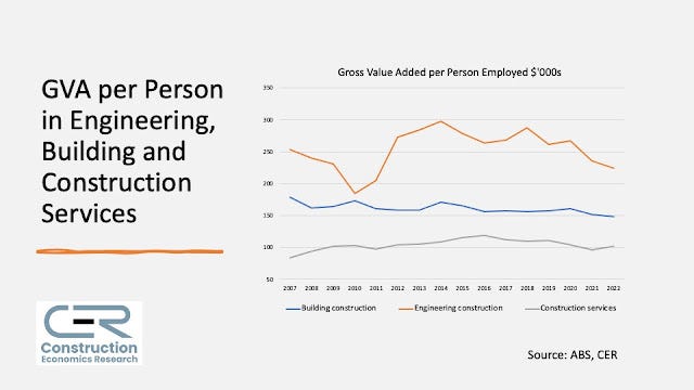 Over the last 15 years, construction productivity in Australia has gone through a long cycle and ended up more or less where it began. Rising from $115,000 per person employed in 2007 to $149,000 in 2014, an increase of 29%, GVA per person employed then started falling and was back to $125,000 per person in 2022.
